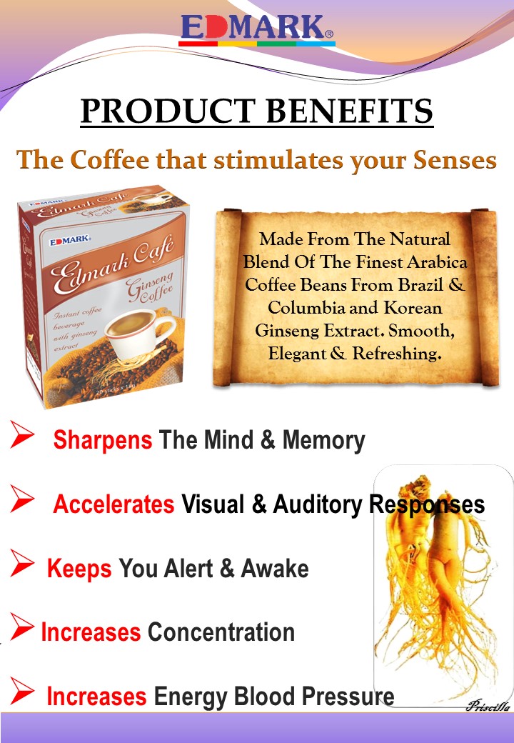 Made from a natural blend of the finest Arabica coffee beans from Brazil and Columbia, and infused with Korean Ginseng extract, which is known for increasing longevity. A smooth, elegant and refreshing coffee drinking experience, EDMARK’s Ginseng Coffee is a health drink that will truly satisfy your discriminating taste.