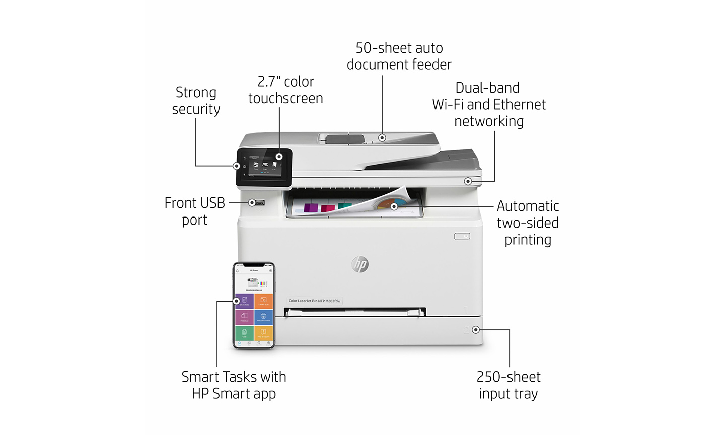 - Auto duplex printing; Scan to email; 50-sheet ADF; 2 paper trays (standard)