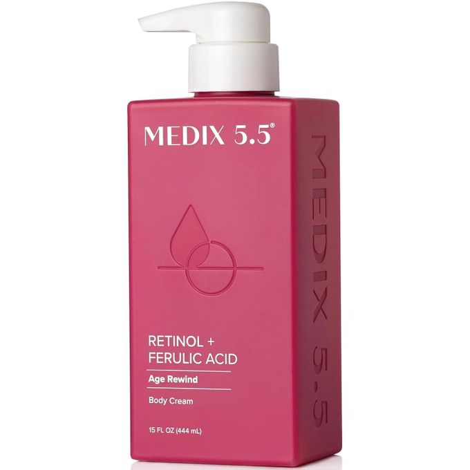 Transform the way your skin looks and feels with Medix 5.5 Retinol + Ferulic Acid Age Rewind Body Cream (444ml)βa powerful yet gentle anti-aging body moisturizer designed to smooth, firm, and restore mature skin. Infused with vitamin A (retinol), this dermatologist-recommended ingredient works deep within the skinβs surface to reduce wrinkles, fine lines, crepey texture, and signs of sun damage while supporting collagen production for firmer, younger-looking skin.