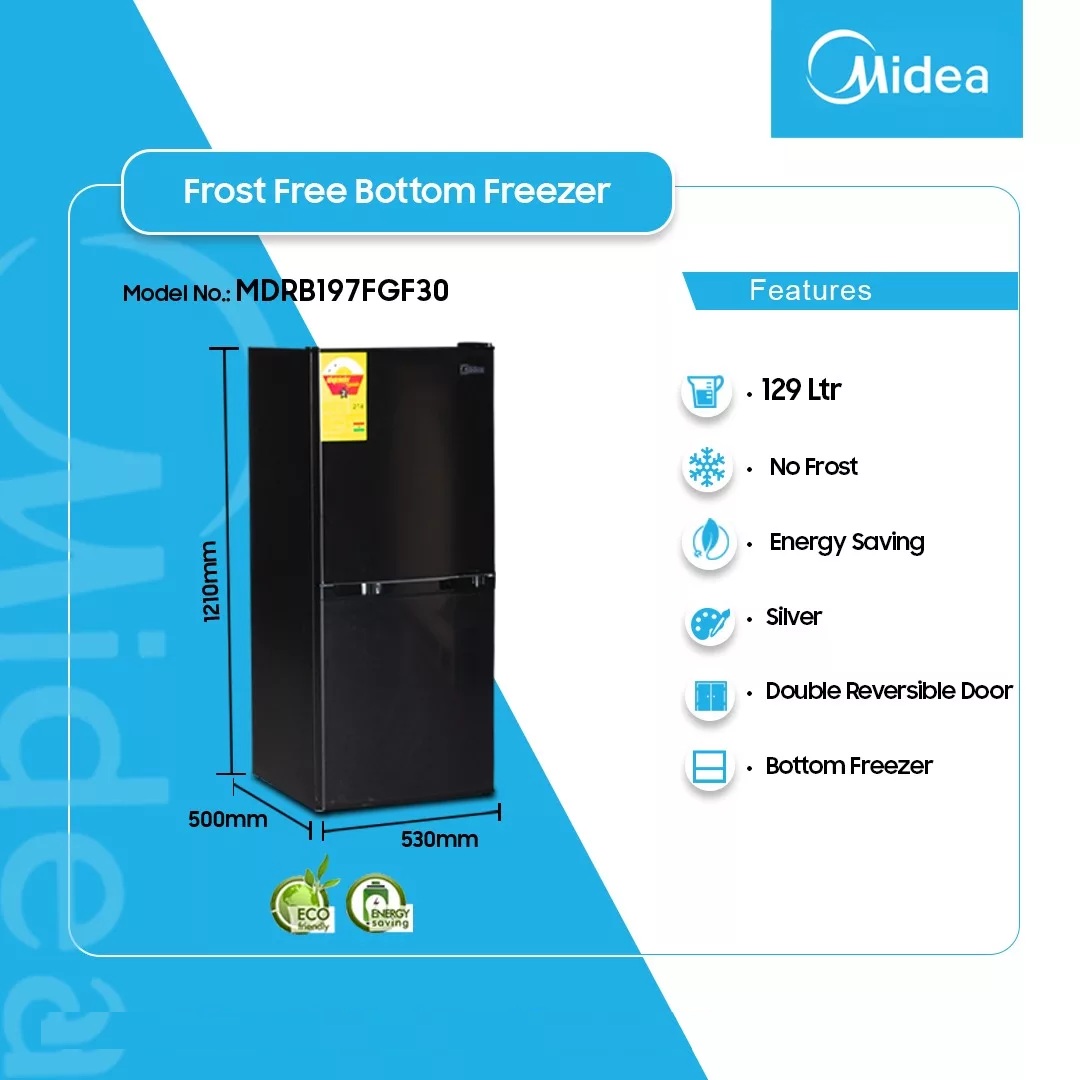 Midea 129ltr Double Door Bottom Freezer DOUBLE DOOR ▪ BOTTOM FREEZER ▪ REVERSIBLE DOOR ▪129 LITERS ▪NO FROST ▪ENERGY SAVING Midea 129ltr Double Door Bottom Freezer Mdrb197fgf30 is now available in our store. Check out the details below! Buy now on Ololo Express