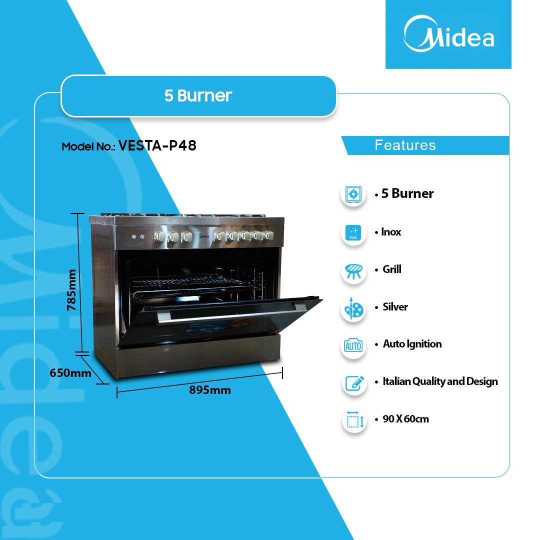 Midea 5 Burner Gas Cooker With Oven And Grill Industrial Vesta P48c is now available in our store. Check out the details below!