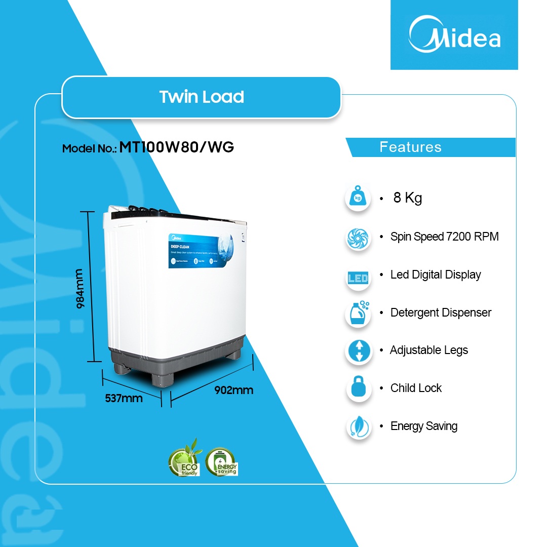 Midea 8kg Twin Tub Washing Machine Mt100w80/Wg is now available in our store. Check out the details below!