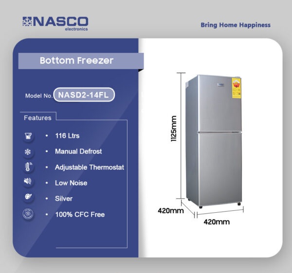Nasco 116Ltr Bottom Freezer Refrigerator NASD2-14FL