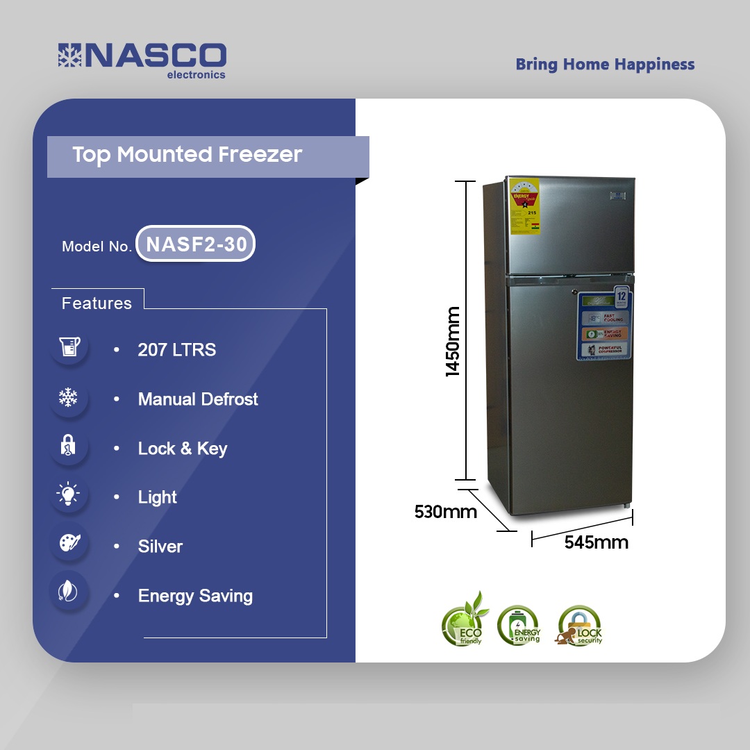 Nasco 207ltr Double Door Top Mount Refrigerator LOCK & KEY FAST COOLING SILVER TOP MOUNT FREEZER ENERGY SAVING Nasco 207ltr Double Door Top Mount Refrigerator Nasf2 30 is now available in our store. Check out the details below! Buy now on Ololo Express