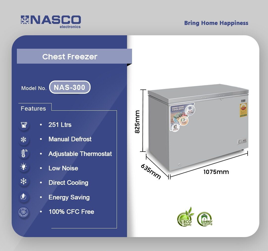 The Nasco 251Ltrs Chest refrigerators/freezer/">Freezer NAS-300 delivers exceptional storage capacity for households, shops, and businesses. With its spacious 251 litres of interior space, it keeps meats, seafood, vegetables, and beverages perfectly preserved for longer periods. Whether youβre storing weekly groceries or bulk purchases, this freezer ensures your food stays fresh, flavorful, and ready when you need it.