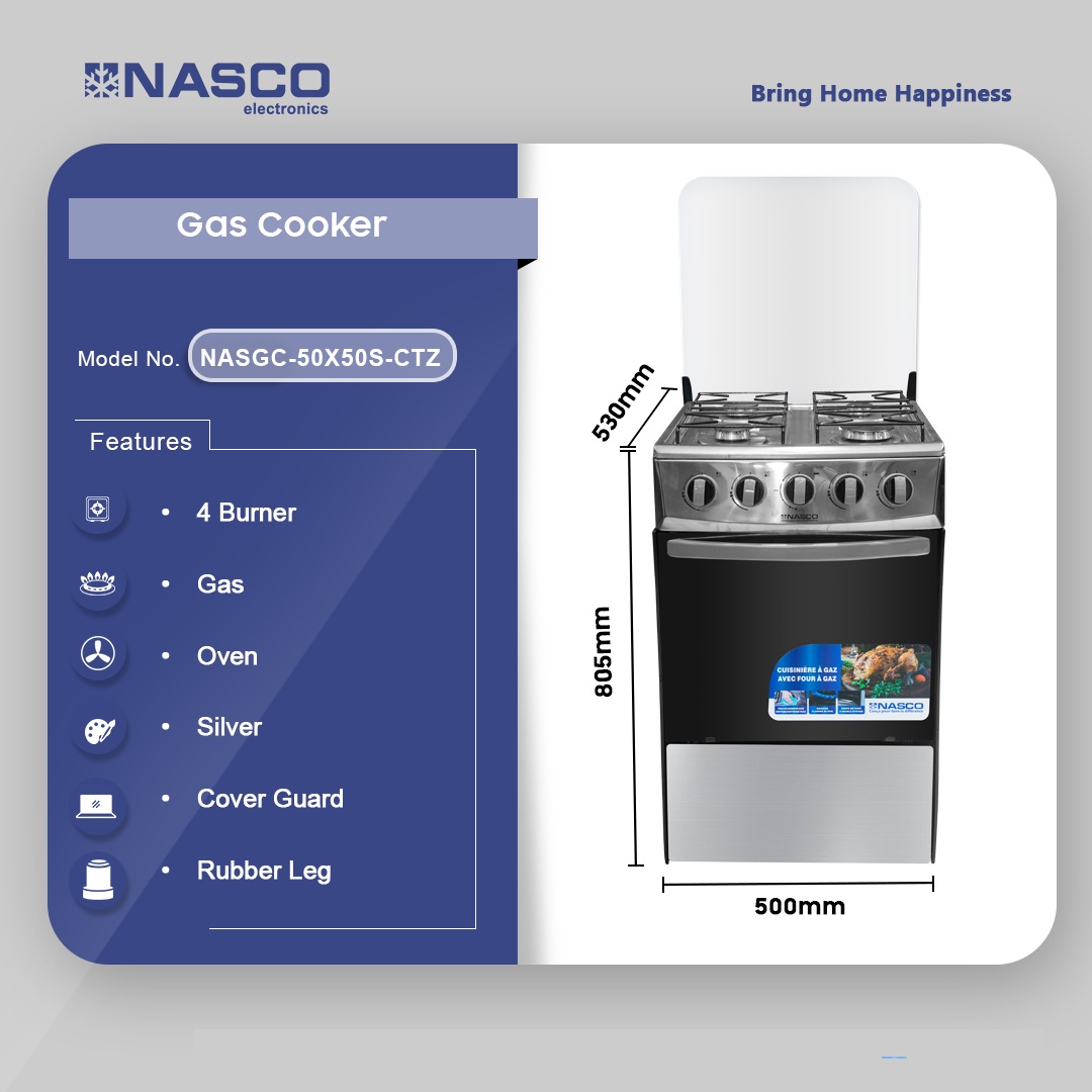 Nasco 4 Burner Gas Cooker Oven Nasgc 50x50s Ctz in Ghana Nasco 4 Burner Gas Cooker with Oven – Efficient & Stylish Cooking in Ghana Fast & Reliable Cooking with 4 Gas Burners Experience effortless cooking with the Nasco 4 Burner Gas Cooker, designed for maximum efficiency and convenience. Whether you’re simmering, frying, or boiling, the four high-powered gas burners provide even heat distribution, ensuring your meals are cooked to perfection. With a 50 x 50 cm compact design, this gas cooker fits seamlessly into any kitchen space, making it a top choice for homes in Ghana. Durable & Modern … Nasco 4 Burner Gas Cooker Oven Nasgc 50x50s Ctz is now available in our store. Check out the details below! Buy now on Ololo Express