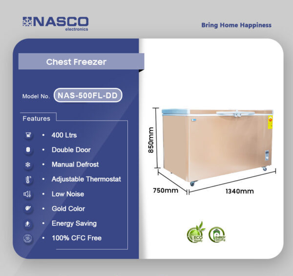 The Nasco 400Ltrs refrigerators/freezer/">freezer/">Double Door Chest Freezer NAS-500FL-DD offers exceptional space for both home and commercial storage. Its generous 400 litres capacity accommodates everything from frozen meats and fish to ice cream, drinks, and vegetables with ease. The double door design makes it convenient to access and organize your items, ensuring maximum freshness every time.