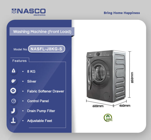 Engineered with energy-saving technology, the Nasco NASFL-J8KG-S washing machine reduces electricity usage without compromising on powerful cleaning results. Its durable build ensures years of reliable service, making it a smart investment for modern homes. With its eco-friendly efficiency and advanced features, this washer combines performance, savings, and convenience to deliver the perfect laundry solution.