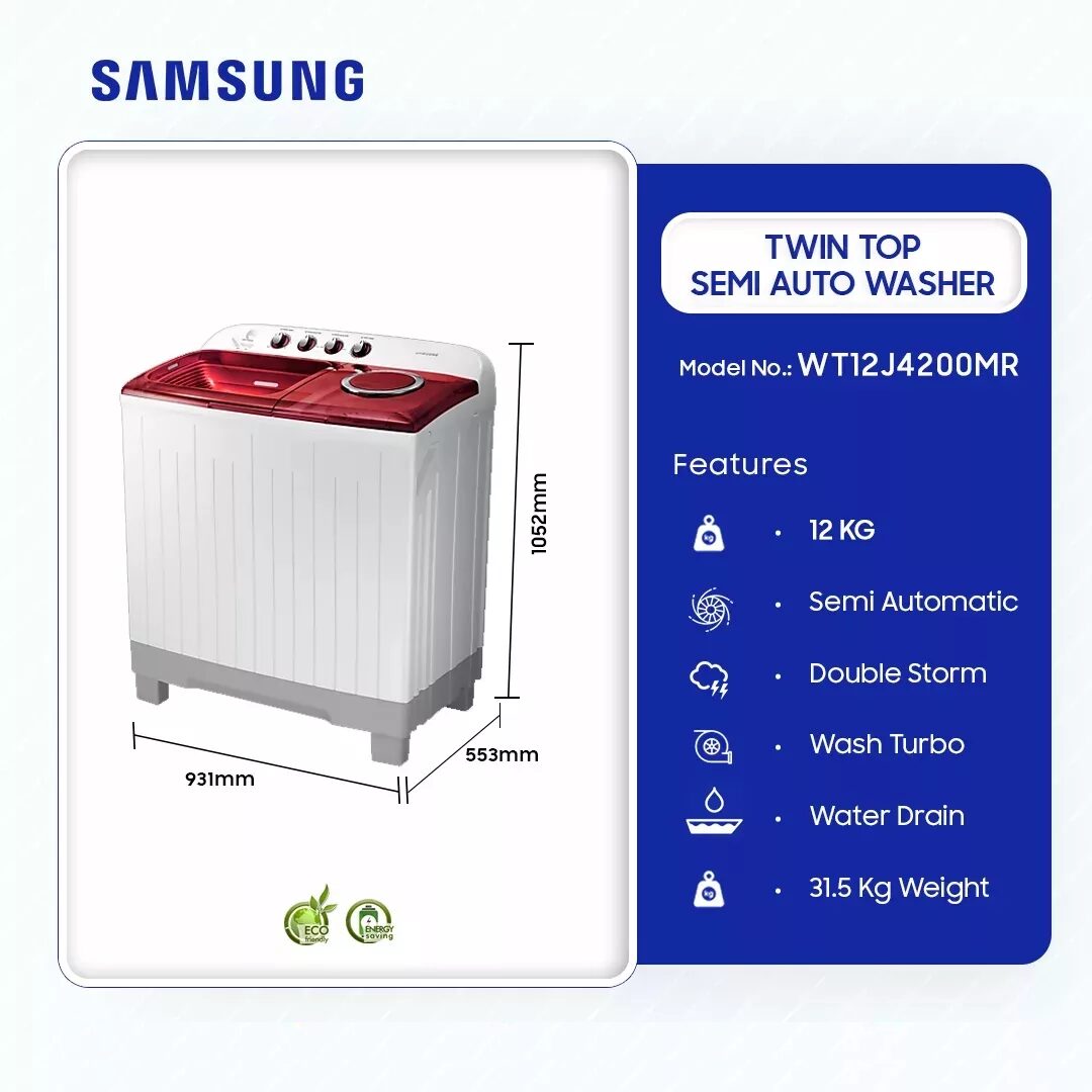Samsung 12kg Twin Top Semi Auto Washer Washing Machine Wt12j4200mr is now available in our store. Check out the details below!