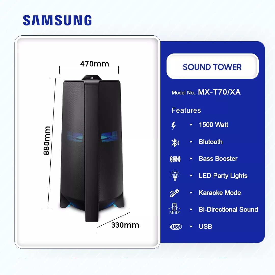 Samsung 1500 Watt Power Audio MX-T70/XA in Ghana – Buy Now Pay Later Unmatched Power with 1500W High-Energy Sound Transform any space into a concert-like experience with the Samsung 1500 Watt Power Audio MX-T70/XA. Designed for powerful, immersive audio, this tower-shaped speaker system delivers deep bass, crystal-clear highs, and an overall explosive sound performance that fills large spaces effortlessly. Whether you’re hosting a house party, event, or just enjoying your favorite tunes, this speaker is built to impress. Double Speaker System for Superior Sound Quality The Samsung MX-T70/XA features a dual speaker setup that ensures rich, balanced audio output. With … Samsung 1500 Watt Power Audio Mx-T70/Xa is now available in our store. Check out the details below! Buy now on Ololo Express