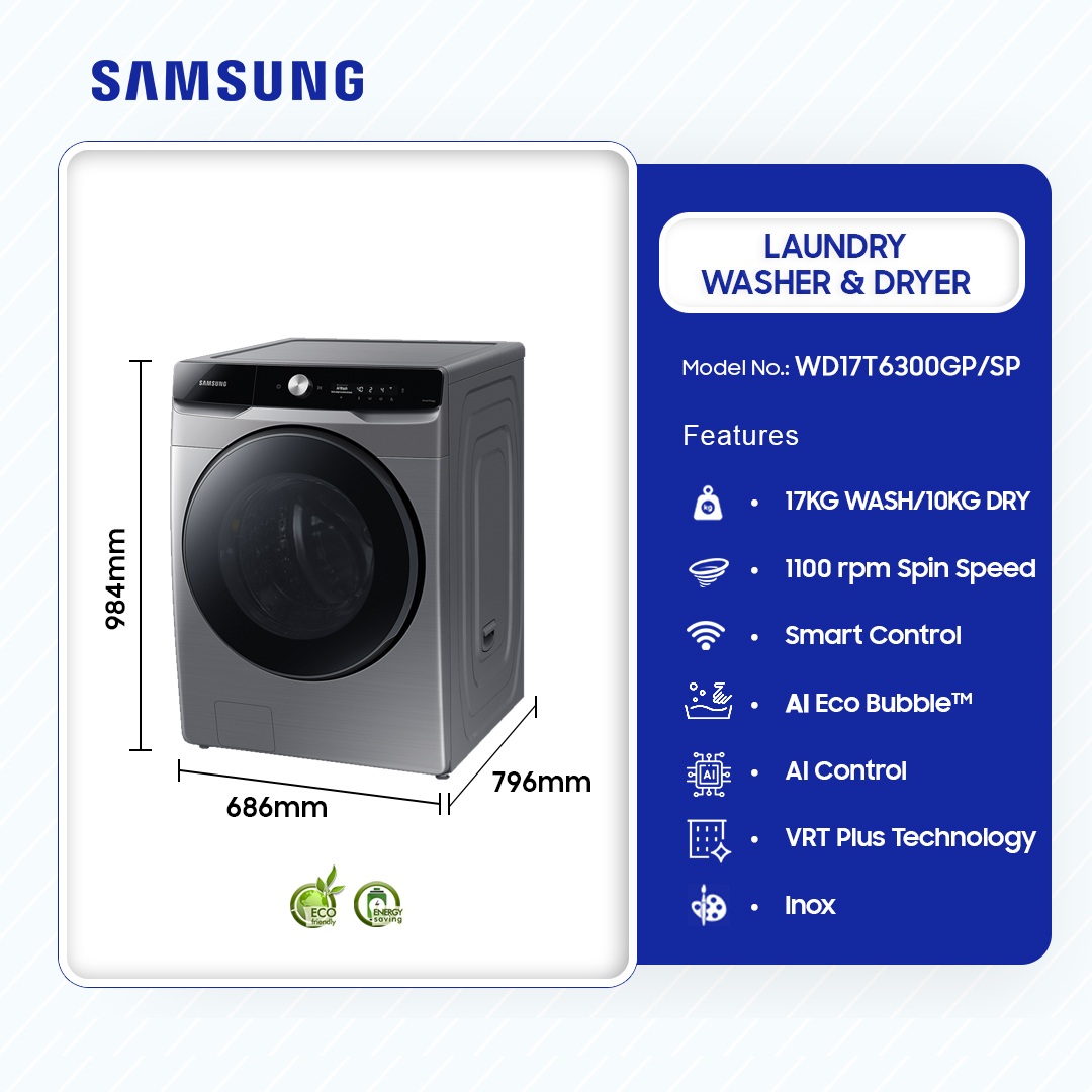 Samsung 17kg Washer And 10kg Dryer Washing Machine Wd17t6300gp/Sp is now available in our store. Check out the details below!