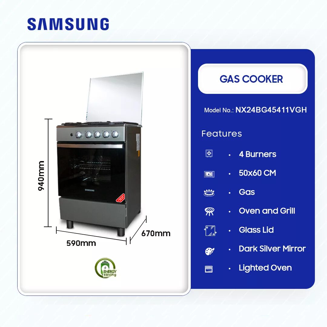 Samsung 4 Burner Gas Cooker With Grill Nx24bg45411vgh in Ghana Samsung 4 Burner Gas Cooker with Grill – Premium Cooking in Ghana Spacious Cooking with 4 High-Performance Burners The Samsung 4 Burner Gas Cooker NX24BG45411VGH is designed for effortless and efficient cooking. With four powerful gas burners, you can prepare multiple dishes at once, saving time while delivering delicious results. Whether you’re cooking traditional Ghanaian meals or international recipes, this stainless steel gas cooker ensures even heat distribution for perfect cooking every time. Large 70L Oven for Bigger Meals With a 70-liter oven capacity, this gas cooker provides ample space … Samsung 4 Burner Gas Cooker With Grill Nx24bg45411vgh is now available in our store. Check out the details below! Buy now on Ololo Express