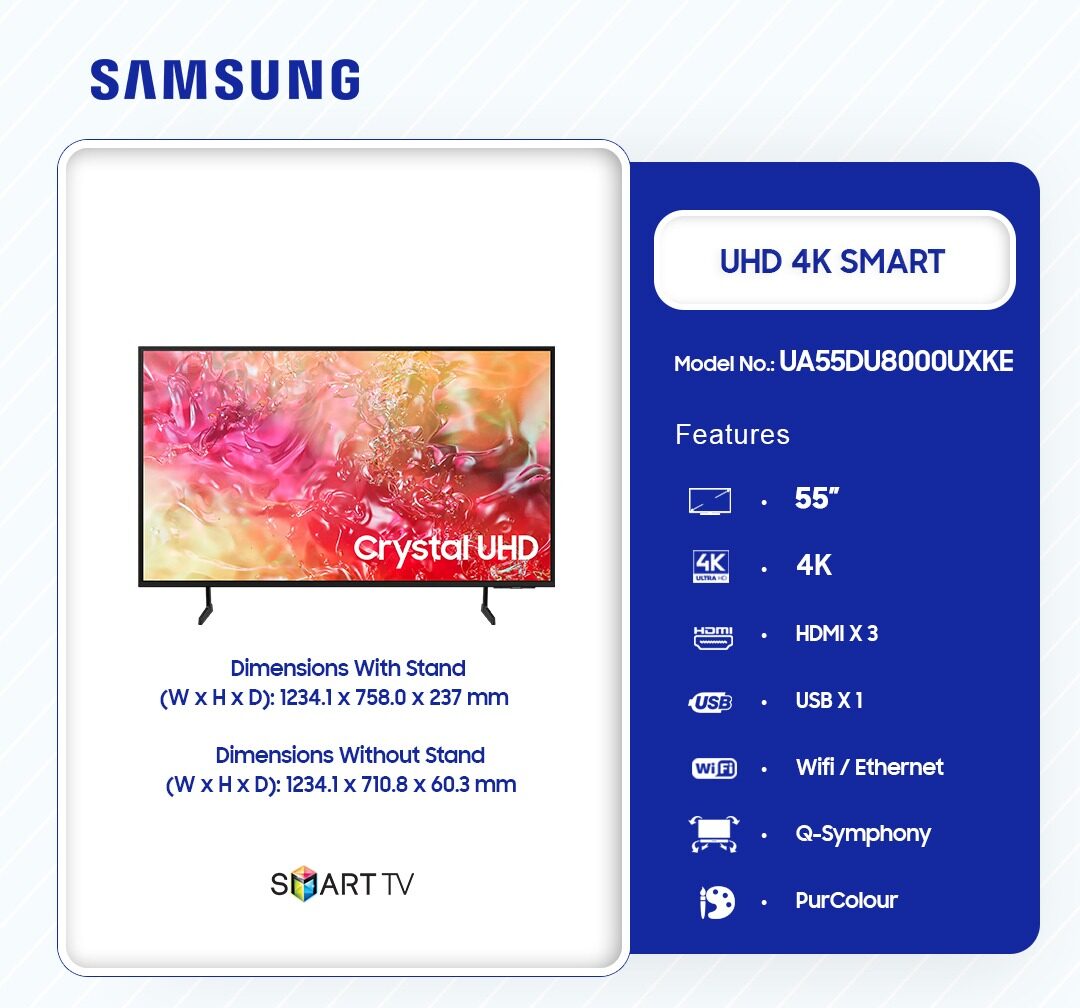 Samsung 55″ Crystal Uhd 4k Smart Tv Ua55du8000uxke in Ghana Transform your home entertainment with the Samsung 55″ Crystal UHD 4K Smart TV. Featuring 4K resolution, it delivers stunning visuals with lifelike detail and vibrant colors. The advanced PurColor technology enhances every scene, creating a viewing experience that feels as real as life itself. Whether you’re streaming movies or gaming, the 55-inch screen ensures you never miss a detail, immersing you in every moment. Bring cinematic clarity and rich visuals into your living room with this state-of-the-art smart TV. Seamless Connectivity for Modern Living The Samsung Crystal UHD Smart TV … This Samsung 55″ Tv Ua55du8000uxke is now available in our store. Check out the details below! Buy now on Ololo Express