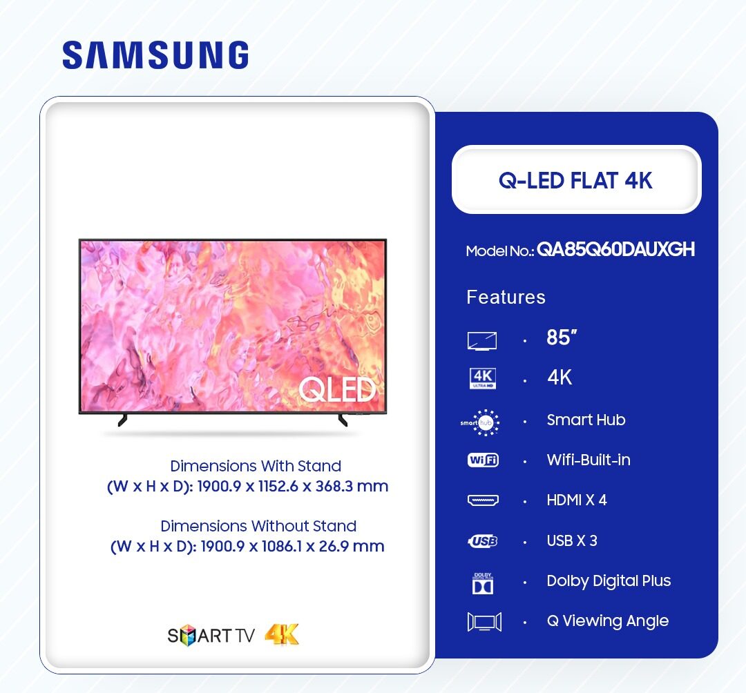 Samsung 85″ QLed 4k Television Qa85q60dauxgh is now available in our store. Check out the details below!