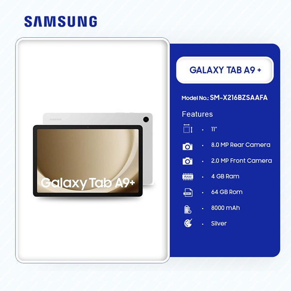 Silver Samsung Galaxy Tab A9+ 64GB 4GB in Ghana Sm X216bzsaafa is now available in our store. Check out the details below!
