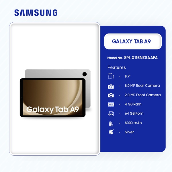 Silver Samsung Galaxy Tab A9 64GB 4GB Sm X115nzsaafa is now available in our store. Check out the details below!