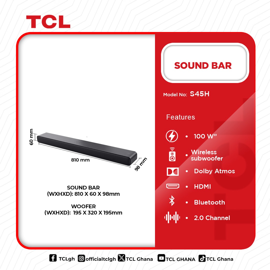 Tcl Audio Sound Bar 100w S45h in Ghana is now available in our store. Check out the details below!